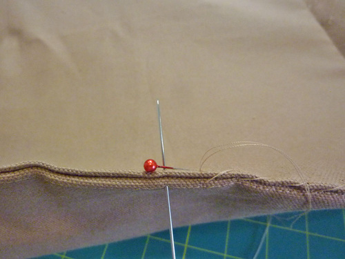 NOTE: “But WHY do I have to hand stitch?” (I heard you shout that from here inside the computer). Because you are working with a large, heavy, and rather awkward box at this point. One side was easy to access, and this gives the lining panel at least one machine-sewn edge for extra security. Jamming the remaining sides under the needle would be challenging at best. But, you still want a finished edge rather than an exposed seam allowance, so a neat hand stitch is a good option. - Tuck in the seam allowance so the seam line aligns with the folded edge of the lining panel. Pin the two layers together and whip stitch to secure.