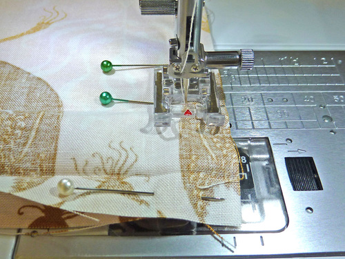 - Stitch the second side from bottom up, stopping and locking the seam at the lower marking pin.
