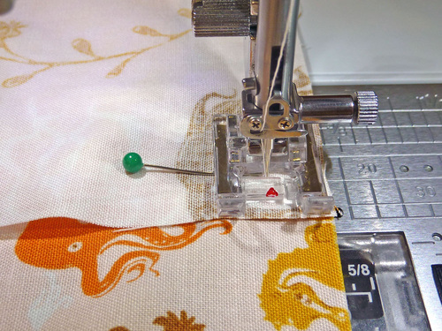NOTE: If you don’t have different colors of pins, you can switch the direction of the marking pins. For example, place the marking pin heads out toward the raw edge while all the rest of the pins are placed heads-in. - Re-thread the machine with thread to best match the lining in the top and bobbin.