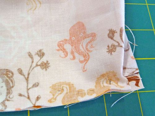 - Place one folded edge along the revealed seam allowance, aligning the fold on the seam line. Pin in place from corner to corner.