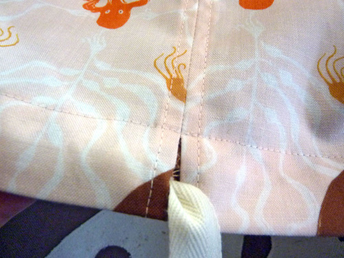 - Work it all the way through the channel until it comes back out right where you started. Even up the the ends of the tape. Take off the safety pin and tie each end of the twill tape into a small knot.