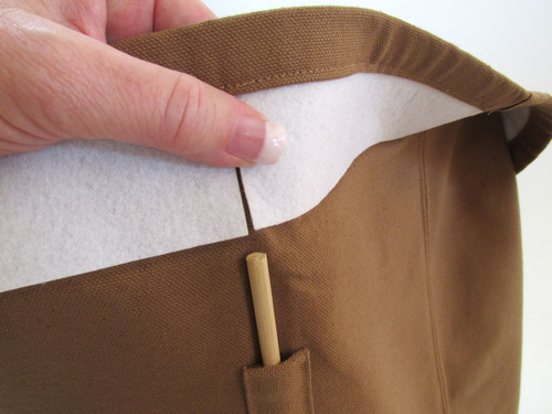 - Find the four 20” dowels. Slip one dowel into each corner casing. The dowel should go all the way down to the base of the exterior and should extend at the top to just below the interfacing.