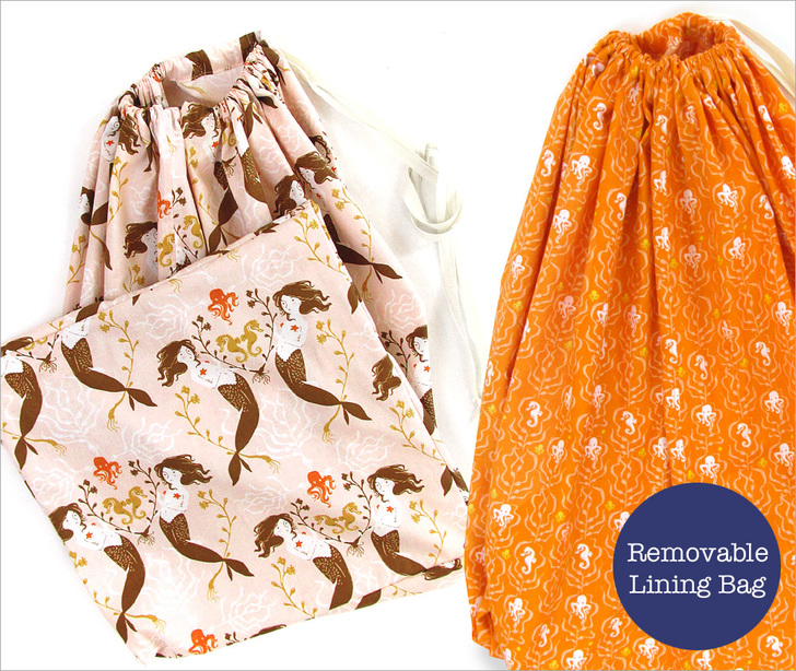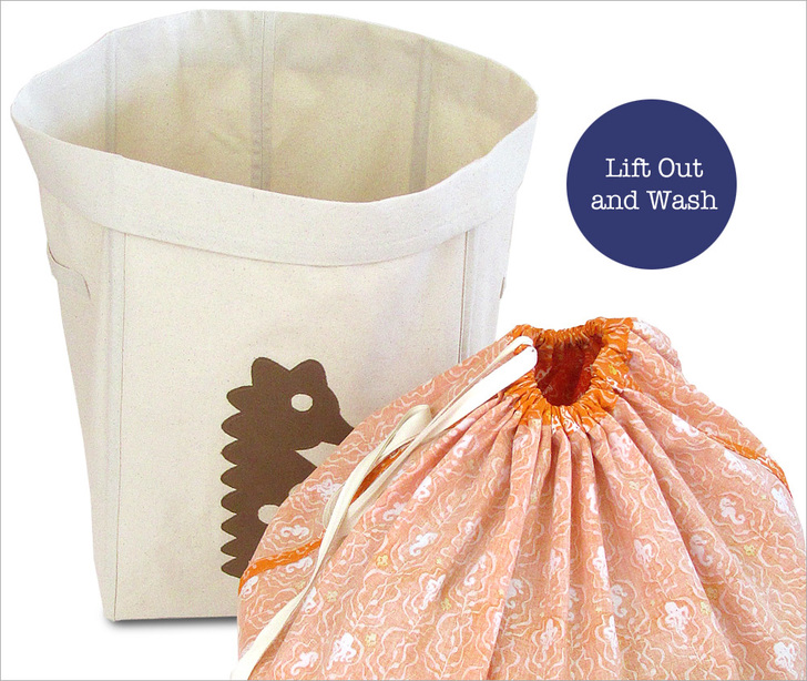 Solution #2: a removable lining bag, which contains the dirty clothes and helps insure the collected mess is easy to lift out and carry into the laundry room. This gathered lining bag has finished seams throughout, and since it’s quality quilting cotton, it’s ready to stand up to plenty of “washability.” In fact, you could even toss in the lining bag along with the load of laundry.