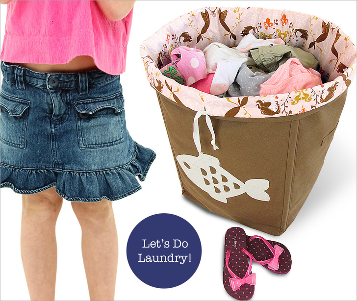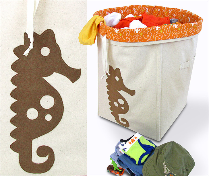 We’re comin’ clean! Or at least giving you the tools to make it easier to get those piles of dirty clothes off the floor, into a hamper, and eventually on their way to the laundry room. If you took out the garbage this week, you’ll immediately recognize the theory behind this cool two-part hamper: the exterior “box” provides the shell (and does it very handsomely if we do say so ourselves), and the interior bag is like a waste can liner, dropping in and folding over the top. Fill ‘er up, then cinch ‘er up and carry the dirties to the wash. We suggest sturdy canvas for the exterior and delightful cotton for the lining. Both of our fun under-the-sea appliqués are available as free downloads.