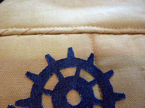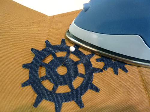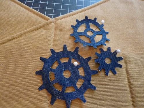 - While the top panel is still flat, place your optional appliqués. Ours are die-cut from a Dritz Denim Iron-On Patch. We used a the Sizzix Big Shotdie-cutting machine and a Tim Holtz Gadget Gears die pattern. Follow our lead, use your own design, or use one of the fun Dritz Patch Templates, which can be cut by hand.
