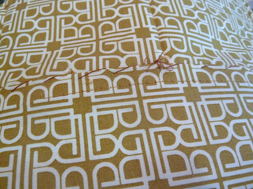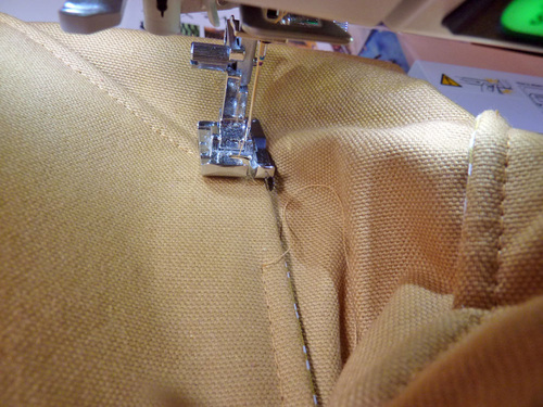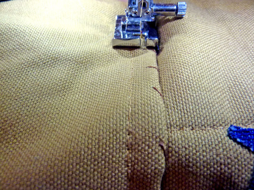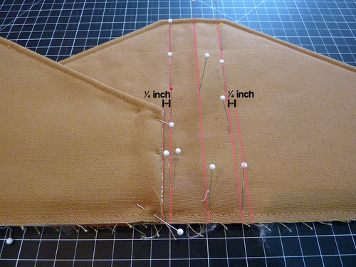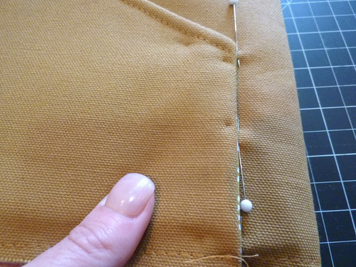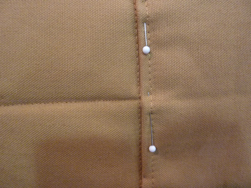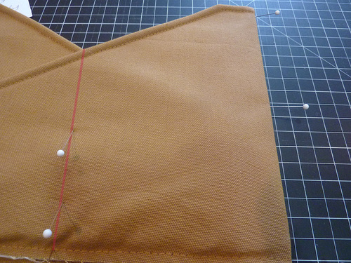 - Unpin the back overlap so you can stitch the three front vertical seams with the panels flat.