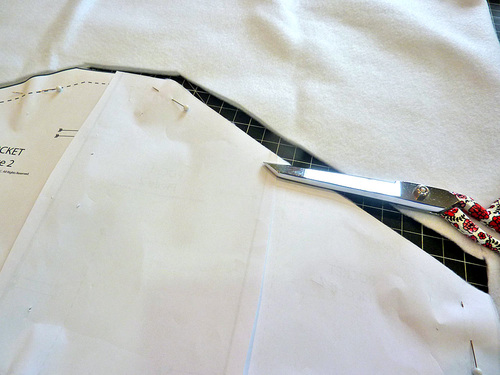 Using the assembled pattern, cut TWO – on both pieces, trim back the bottom straight edge ½” – this will keep the bulky fleece out of the center seams.