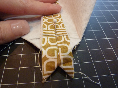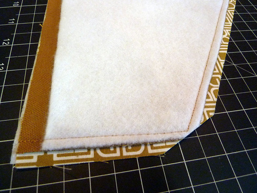 - Trim the seam allowance at each corner to ¼”. Because you measured and pinned so precisely, your corner patches will now sit right along the bottom edge of the bag.