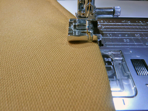 - First topstitch the side edge of the overlapped panel in place. Use a ¼” seam allowance so you can make a neat, intersecting corner with the original topstitching line along the top of the panel. We again used our Janome Quarter Inch Seam foot. And we lengthened our stitch to match the other topstitching.