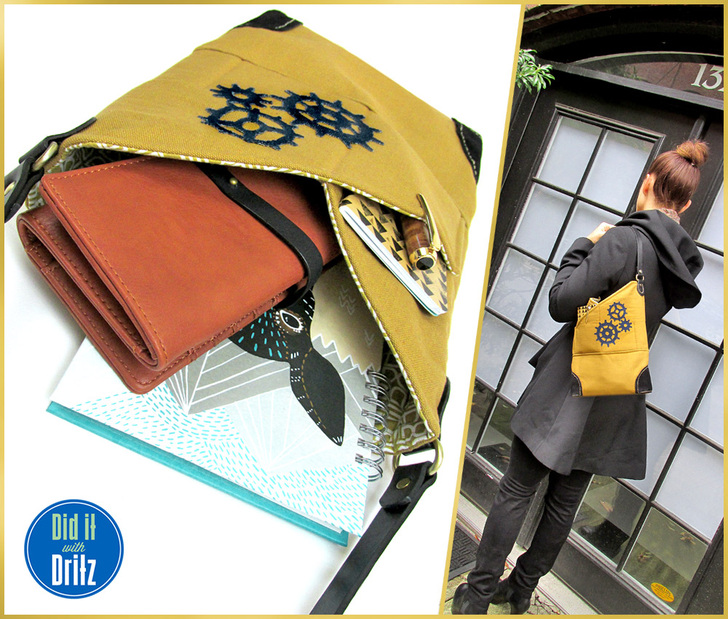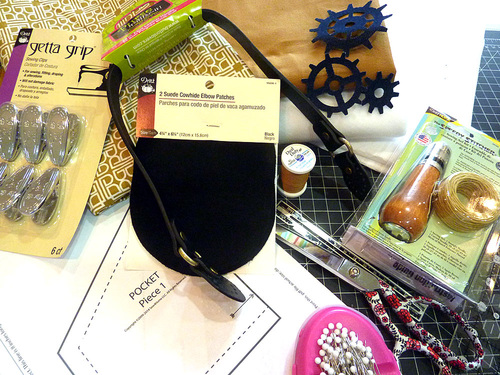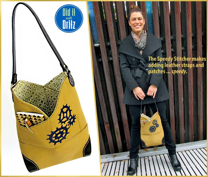 Ahhhh, the classic leather elbow patch… it can transform a rumpled guy in a tacky corduroy jacket into that suave and sophisticated history teacher you had a mega-crush on sophomore year. But… what else can it do? It can become a unique accent for a slim style bag. We cut one leather elbow patch in half to fashion corner accents, then put a denim style patch through a die-cut machine to create a set of interesting iron-on embellishments. The Dritz Home Speedy Stitcher tool is what’s used for the heavy-duty stitching on both the corner patches and the bag’s handle.