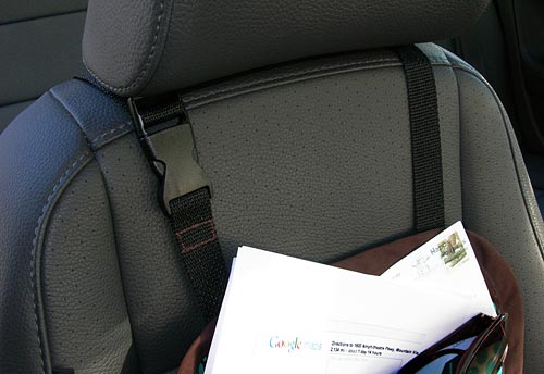 - To attach the car caddy to your car’s seat, loop the webbing around the headrest and close the buckle. Adjust the strap so the caddy is secure at the top and rests on the seat at the bottom.