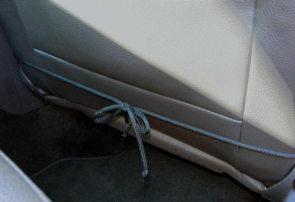 - To secure the caddy at the bottom, loop the nylon cording through the grommet holes, so the knotted ends face towards the back. Tie the cording closed with a knot or bow after wrapping around the bottom of the seat.