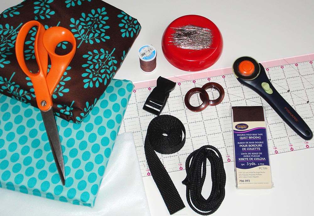 - 3½ yards (two packages) of ½” – 1″ wide bias binding for top pocket edges and entire outside edge of caddy body: we used Wrights ⅞” width, double fold, bias quilt binding in Seal Brown – You could also make your own bias binding, using our step-by-step tutorial