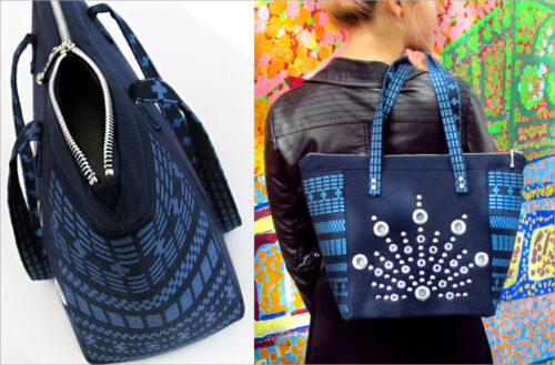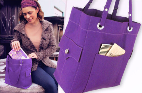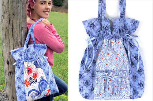 This is what we call aย statement bag. It’s specifically designed to make the best use of a fabric collection’s boldest, brightest colors and motifs. Thereโ€™s a free pattern for the unique curved “wave” pockets on the front and back.