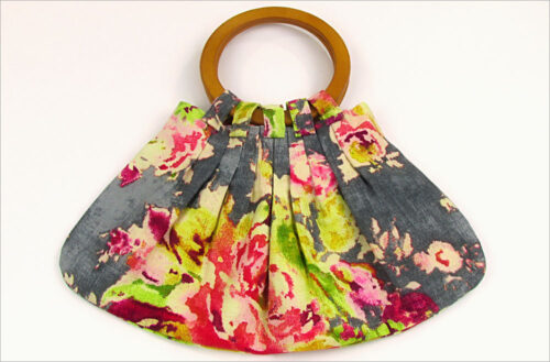 Often seen in woven straw, crocheted yarn or macrame, round handle bags like this one are a vintage classic. Our pleated, semi-circle design features a soft upholstery fabric with a large, bold motif. Includes a free pattern.