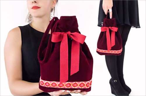 Perfect for holiday parties: an elegant cinched evening bag in a mini bucket shape. We used two of the most popular special occasion fabrics: velvet with a gorgeous drape and silk dupioni with its crisp, slightly textured finish.