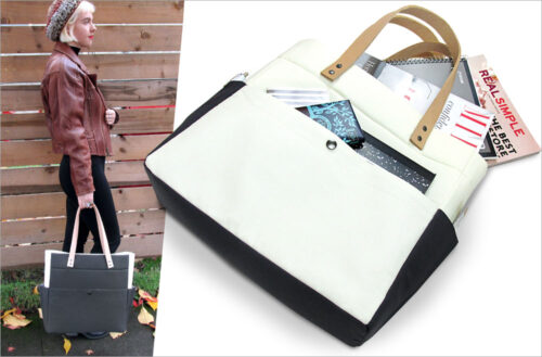 Light/dark โ€“ they say opposites attract, and that is at the core of this gorgeous two-tone tote. The striking contrast gives the project a modern look with a sleek simplicity that sets off the focal point: real leather handles.
