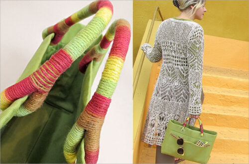 Our simple box tote adds eye-catching yarn wrapped handles + hand stitched accents for a pop of bold Summer color against a solid background. We chose fiery red, fresh green, and golden yellow. It’s surprisingly easy.