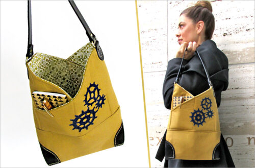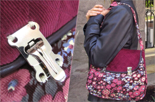 We used a cool metal closure for this pretty shoulder bag design. Thereโ€™s a curving side gusset to add structure and a unique curved flap with accent piping. All done with standard weight cottons! So fun, we made two samples!
