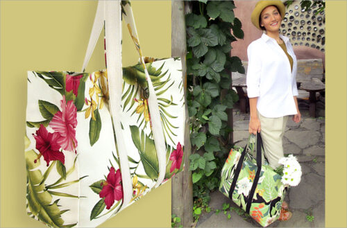We used barkcloth in bold tropical prints for our dramatic totes, but other mid-to-heavyweight substrates would work too. The generous size makes it perfect as a market shopper, everyday carryall or even a diaper bag alternative.