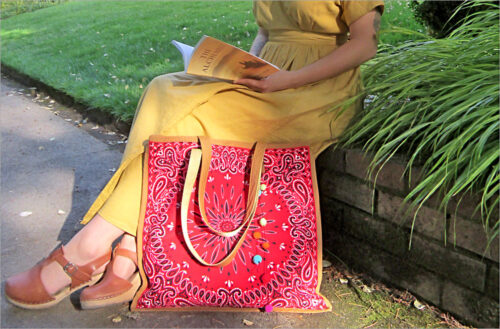 This project is excellent for young kids or anyone just learning to sew. Classic bandanas on the outside, denim on the inside, layered webbing handles, and bound all around. Add a mini pom tassel for extra fun.