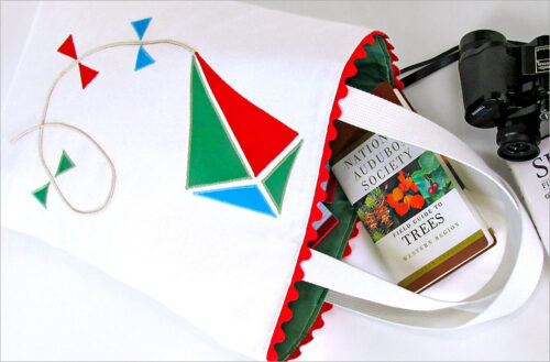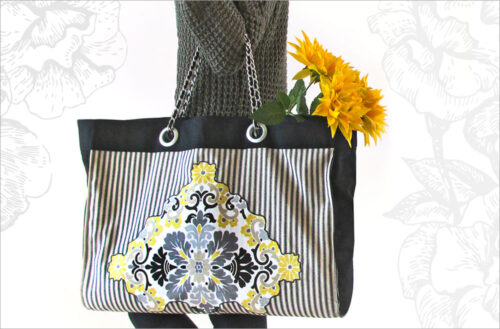 Make a bold statement as you stroll the open air markets of France – or perhaps simply while shopping the aisles of your local grocer. This bag is a lovely blend of unique trim, dramatic fabric, precise fussy cutting, and appliquรฉ.