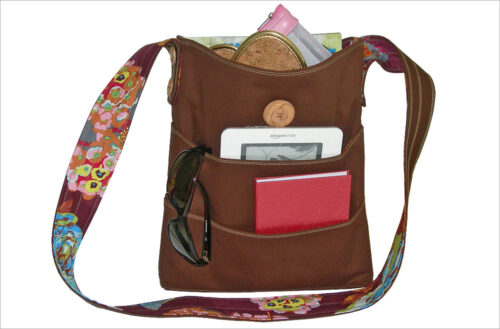 Fussy cutting of multiple motifs is the name of the game in creating this bag’s special look. The front features a fabric flower, andย decorative metal rivets help hold the strap ends in place for a subtle dash of dimension.
