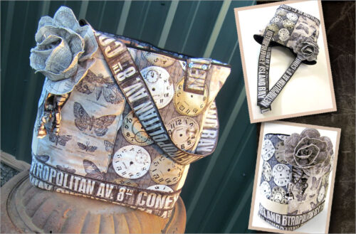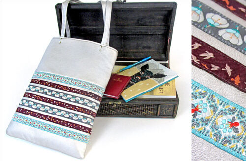 Tall, thin and elegant, this bag could be a runway model. Or maybe at least be carried by one of those long-legged beauties. Soft faux leather is the perfect background for the beautiful jacquard ribbons from Renaissance Ribbons.