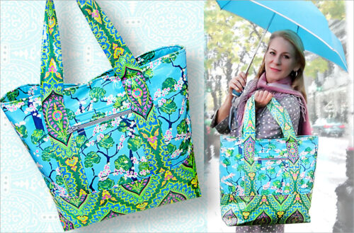 Make it in vinyl, faux leather or cotton laminate to whisk away the weather. We even used a weather-resistant zipper for the outer pocket. With 5″ box corners, you can handle a full load of power shopping rain or shine.