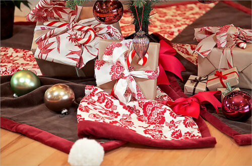 This large, lush tree skirt is over four feet square; grand enough for Christmas morning’s bounty of pretty packages. The pinwheel design is a patchwork classic, simple and sweet. For a bit of whimsy, add giant poms to each corner.