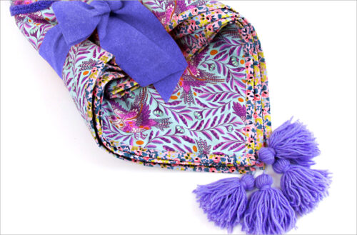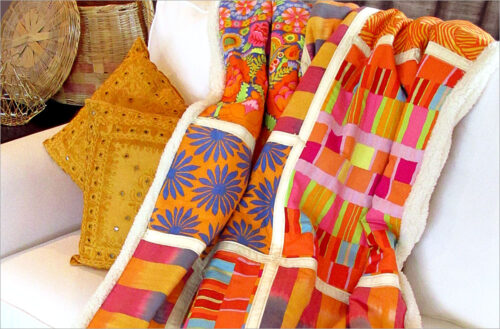We used bold, bright fabrics from Kaffe Fassett to create this bohemian throw. It has a patchwork front bound and backed in super soft sherpa-style fleece โ€“ then hand-tied to finish.