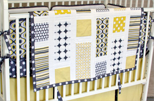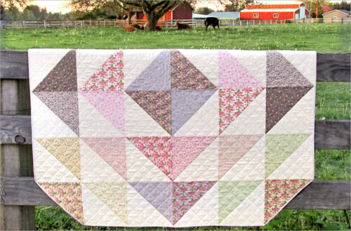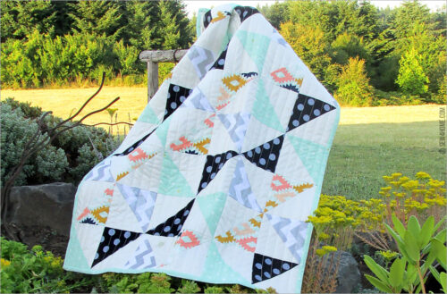 This cute quilt has an intricate-looking pinwheel effect, but it’s just 12 cleverly rotated blocks made up of basic half square triangles. Super beginner friendly! We chose some metallic cotton for a bit of nursery sparkle.