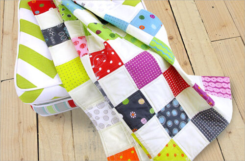 Using 10″ Layer Cake squares, you can whip up this cute and cozy lap blanket in a single afternoon. The patchwork is about as basic as you can get, and the quilting is done with hand-sewn buttons. A very beginner-friendly project.