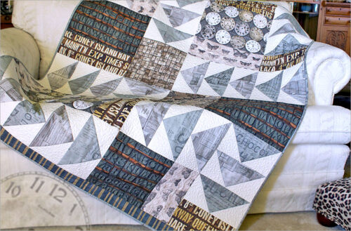 Flying geese blocks combine with the fabricโ€™s vintage motifs to give a beautiful background for free-motion quilting. The variety is a quilter’s dream. Isolate and piece together all the interesting bits into a wonderful collage.