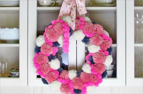 Wreaths are always a popular decorating accent, whether for a special holiday or to brighten up every day. Our 16″ diameter design uses coordinated colors of yarn pom poms along with mini pom trim and some scrap fabric for the hanger.