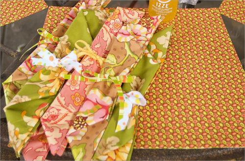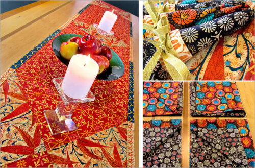 Three tabletop projects in one! A long patchwork table runner plus generous reversible napkins with pretty ribbon wraps. We outline how to measure to best fit the runner to your table and how to adjust the patchwork if needed.