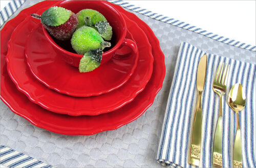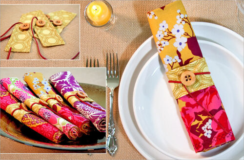Cloth napkins are an instant-gratification winner. We kick ours up a notch with beautiful decorative stitching around the edges of each and a coordinating fabric napkin ring that “ties” them altogether.