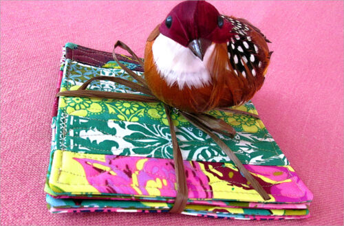 Small pieced strips of colorful cotton plus wavy, free motion stitching give these cute coasters the look of a tiny quilt. Thereโs an edgestitched frame around each coaster that acts as the pivot point for the vertical wavy lines.