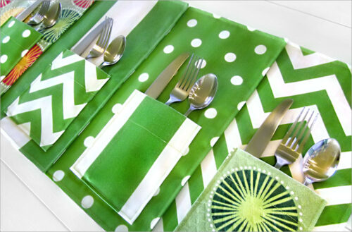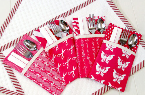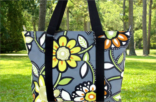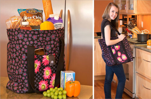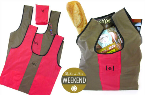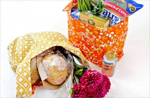 Fabric shopping bags are a green alternative to plastic โ and so much prettier! We created a set of two totes in a handy shoulder sling style. They fold down into a matching wrap-and-tie carrying case. Use your favorite quilting cottons.