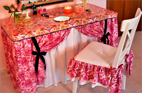 Sitting pretty. That’s what you’ll be when you complete this lovely vanity chair pad. We took a simple center-tufted cushion design, then added deep double ruffles and long beautiful bows to attach the pad to the back of the chair.