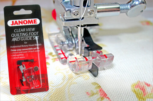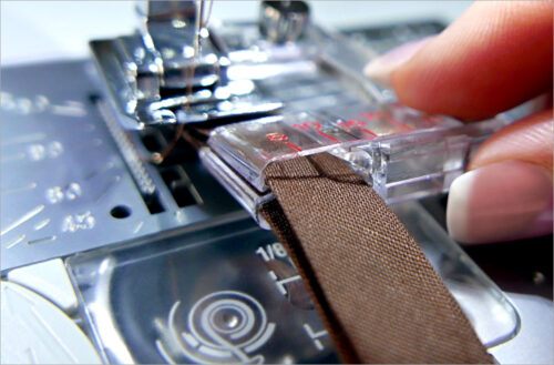 This clever Janome foot helps you attach tape evenly and smoothly to the edge of your fabric. Adjust it to handle widths from 5mm to 20mm. Use both single fold and double fold binding styles, either tape youโve made or packaged.