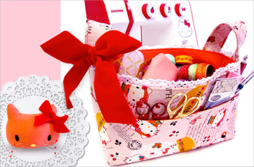 Possibly the world’s most adorable sewing basket. Shorter sides mean easy access, and pockets all around hold tools + notions. Cotton canvas is a perfect weight for the structure. Includes the matching kitty pincushion pattern.