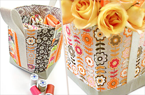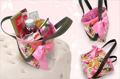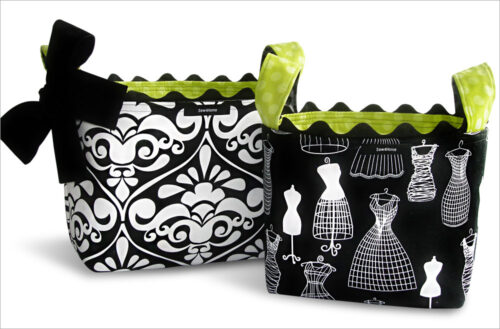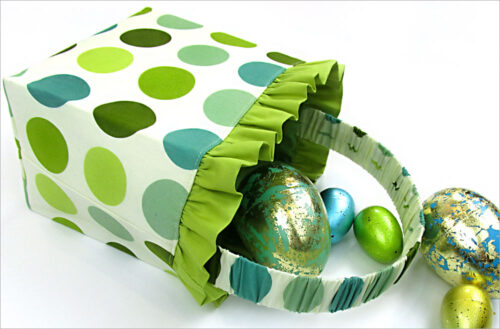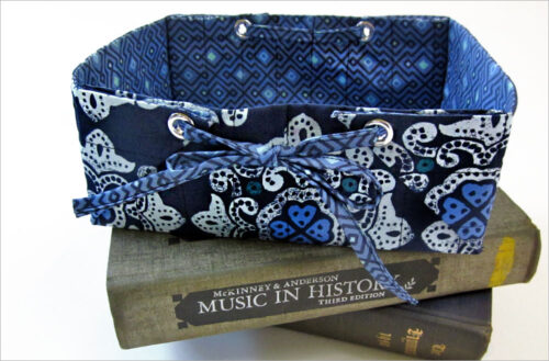 There are so many ways to approach a fabric basket. For this one, we designed a set of unique “V-point” angled handles in a bold contrasting color, then added a big satin bow as a final sweet touch.