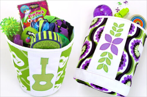 These round fabric baskets make picking up and putting away much more fun and colorful. There are free templates for our cute appliquรฉs or create your own simple shapes. Each bin finishes at approximately 11″ high x 9″ in diameter.