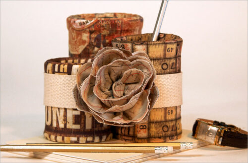 Three sizes of cans are banded together into a unique set โ€“ covered inside and out. Hold pencils and pens, use them to corral cutlery in the kitchen or tidy up make-up accessories in the bath. Measuring instructions are provided.