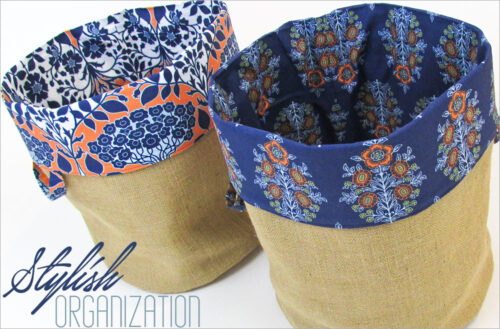 These cute round storage baskets have three types of interfacing to help them hold their slightly soft shape. Mix basic burlap with pretty cotton for a unique decorator style. The lining is fussy cut so theyโ€™re pretty inside and out.