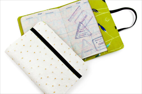With faux leather on the outside and quilting cotton inside, our little folders protect your passport from dirt and keep it flat. Two interior pockets hold it open to the appropriate page, and a stretchy elastic band keeps it shut.