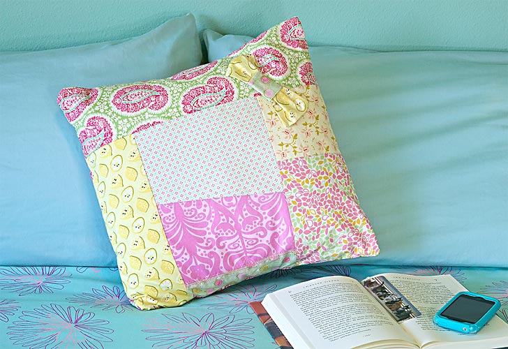 Crazy patch quilting incorporates small scraps of many different fabrics into one block. It came into vogue in Victorian times as a way for ladies to show off their needlework skills whilst passing the time in their parlors. The parlor went out of style along with the bustle (and the word “whilst”), but crazy patch quilting remains a terrific way to use lots of different fabric scraps in one project. This is a great project for incorporating old silk ties or bits of worn-out corduroy pants.