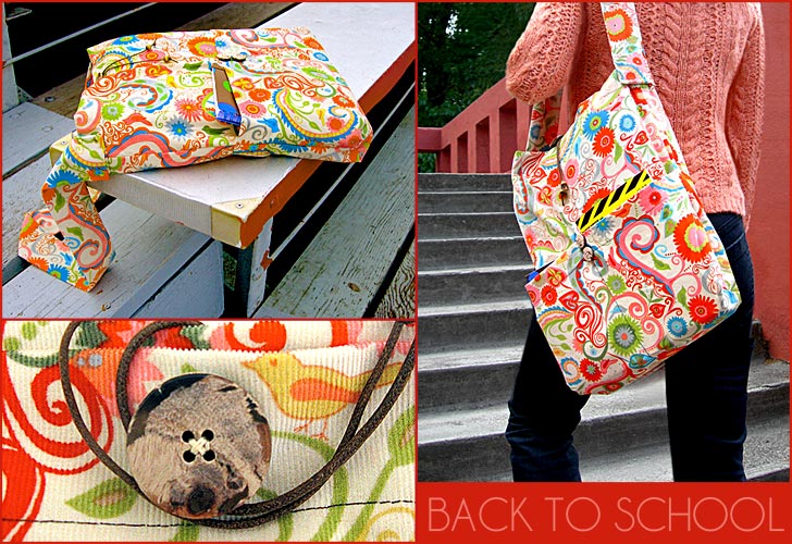 What should you use to carry your school stuff this year? Well, if you’re all about form and structure, the venerable back pack is your friend. But if you want something comfortably soft and slouchy, then go with the book bag: the wild child of school totes. Ours uses no stabilizer, only a lining. The exterior fabric is a velvety corduroy from Valori Wells with the thinnest of wales. Wooden beads, stone buttons and waxed cording create the closures. And, tiny golden rivets attach the strap. So cute… maybe you should keep it as your everyday bag!
