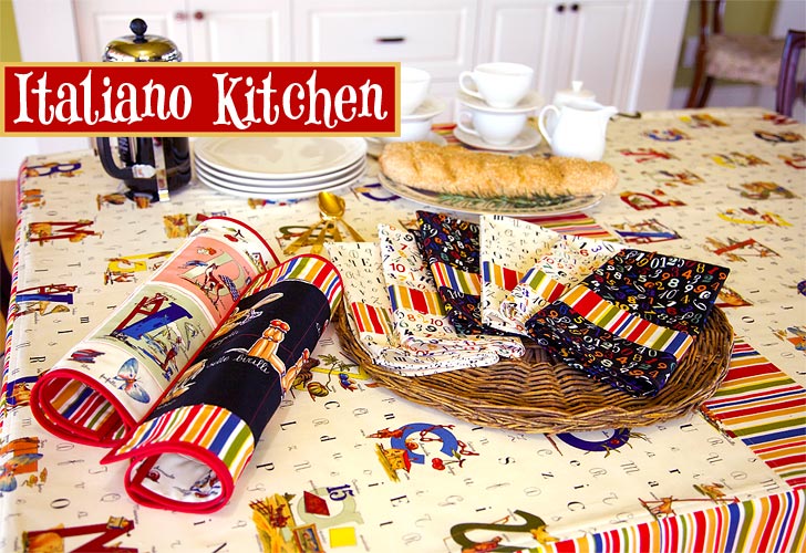 Without a spare month to spend learning Italian in Rome from a handsome young man over plates of spaghetti and glasses of wine, perhaps these placemats can serve a starting point. We used the signature Mutli Blocks Italino fabric from the new Michael Miller collection, Alfabeto Italiano Collezione. The fabric features elaborately illustrated 4″ x 4″ alphabet blocks in wonderful vintage colors.ย Why in just the short time it took to make two placemats, I’ve already learned that “L” is for lanterna (lantern), lepre (rabbit) and libri (books). My impressive vocabulary will undoubtedly come in handy as soon as I step off the plane in Italy and need to locate ‘books on hunting rabbits by lantern light.’